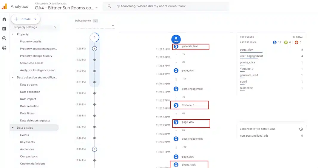 Use GA4’s DebugView or browser developer tools to verify event tracking and data flow.